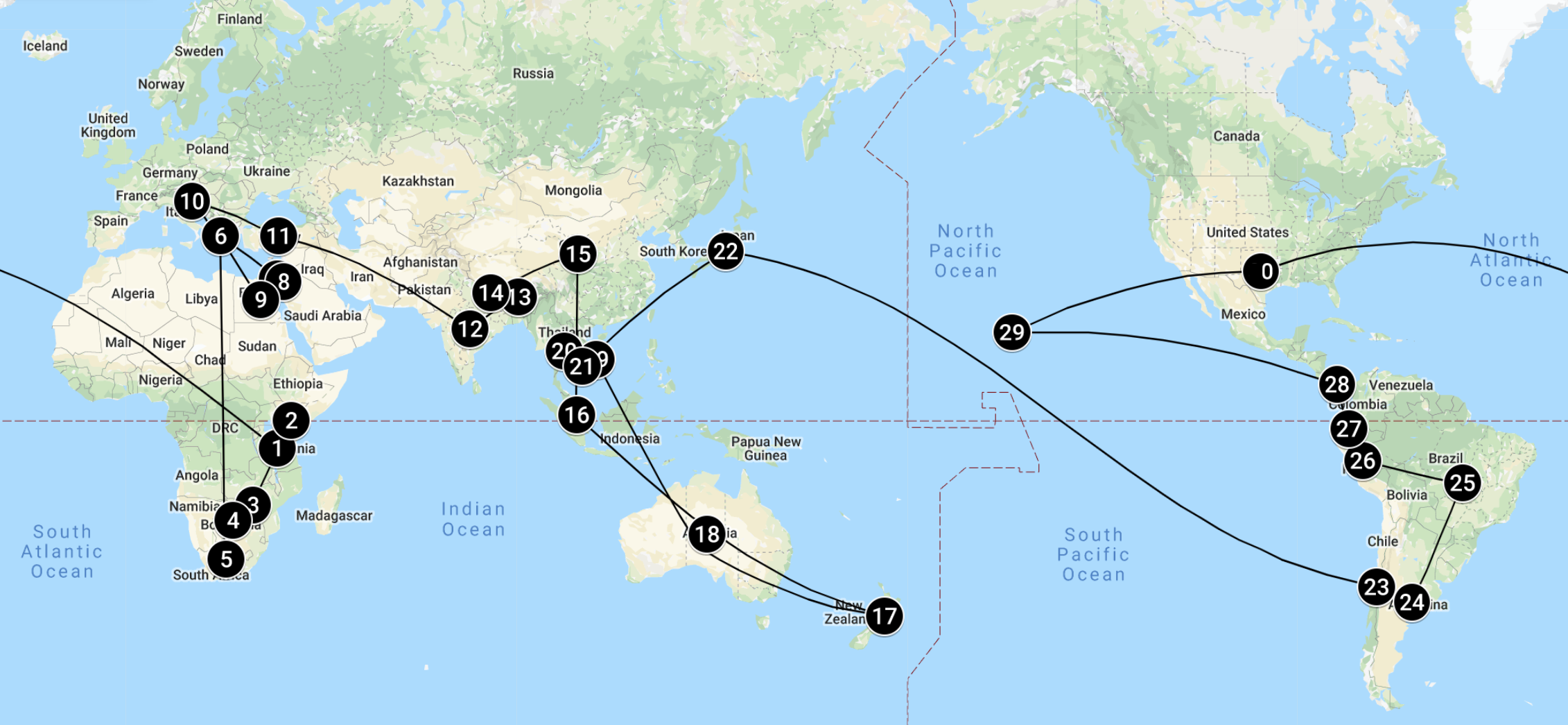 Here’s the map of where we are going, but be warned that our plans will be fluid. As of now we only have stuff booked to when we arrive in Cape Town on September 13th. We’ll stay longer where we like and skip out of what we don’t. If you have a hankering to see some place we are going, tell us and we’ll firm up the dates and meet you there. As long as you bring me some Salsa Doña from Austin. Adios till next year and we leave you to deal with the Donald. Bwahahahaha.
