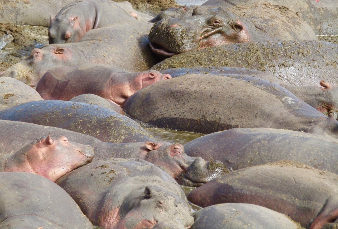 Our first stop after a couple of hours is a hippo pit. The river is choked with hundreds of hippos laying in mud and their oozing excrement. They periodically grunt, swish their short little tails, climb on top of each other, bite a couple of butts, and go back to sleep. At first sight it is disgusting. But being vegetarians, their shit isn’t particularly smelly though we are a mere couple of feet above them on the river bank. And after a while the entire communal slothiness of the thing grows on you. You start picking out a baby here and a mother there or a couple of playful juveniles in the middle or a bad tempered butt biter who farts a lot. Vivian and Evan get quite engrossed in hippo watching like the rest of us. Eventually we all have to tear ourselves from the spectacle when our short break is over and we have to get back to our 4x4s.