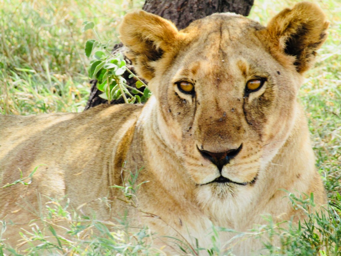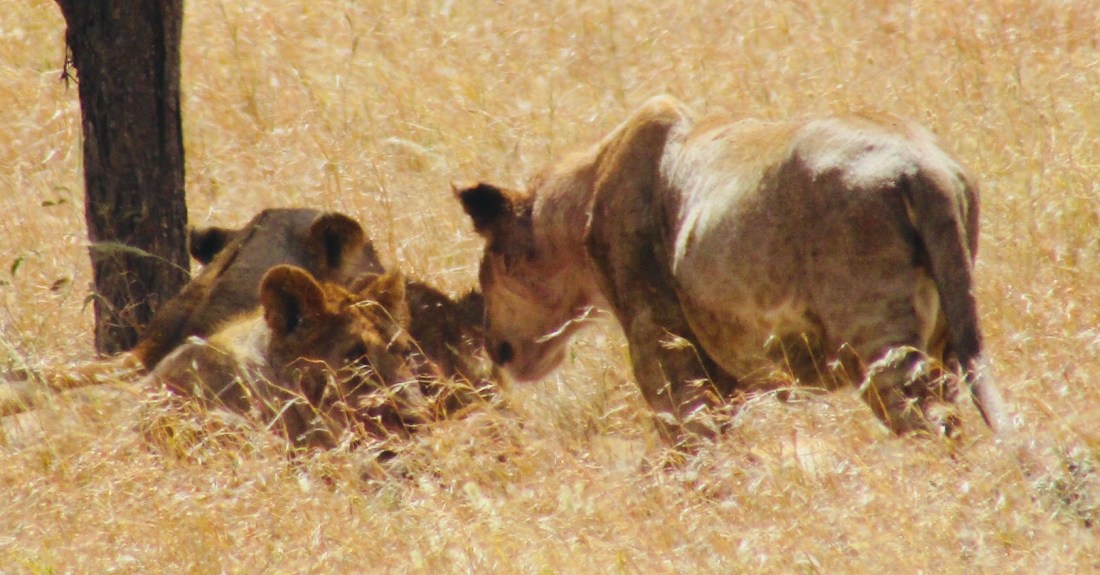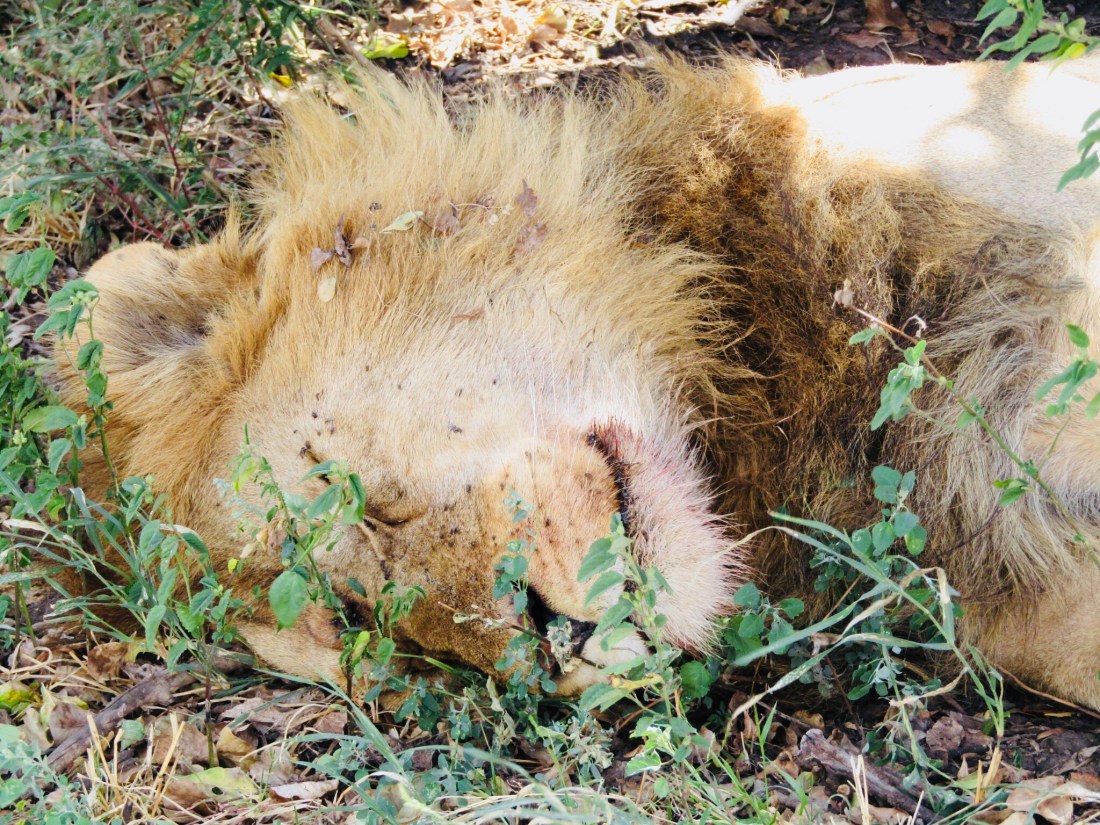 Joshua cautiously pulls off the main dirt road and drives to a low tree under which we discover a resting lion and a young lioness. We drive a hundred yards away to another shady spot to see a huge lioness. Then it becomes clear that we are looking at a pride of lions resting after a kill. One cub is still tugging at the buffalo carcass. Everyone else is resting and licking their own and each other’s bloody chins.