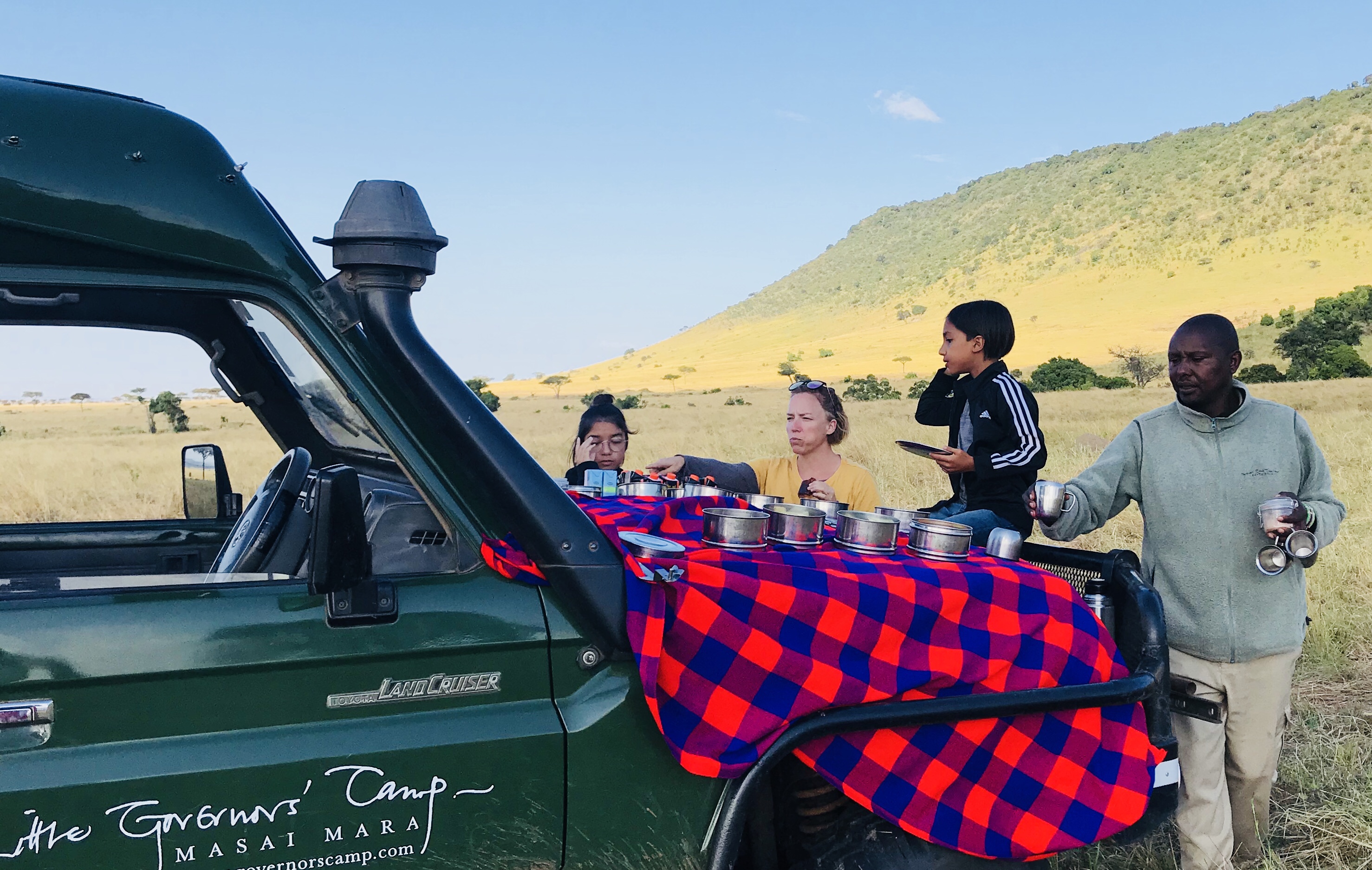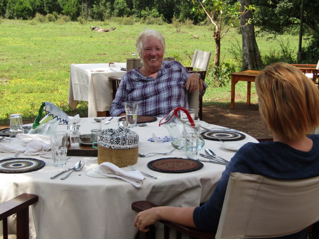 The Little Governor’s Camp is a hangover from the British days if there ever is one. Our manager is George, an elderly Scotsman who has lived in interesting places most of his life. The camp is a collection of a dozen tents around the edge of an escarpment that went three quarters of the way around a wetland down below. There is a bar / lounge tent, a dining tent, and an shaded area in front of the escarpment. It is a short walk down to the Mara river where a boat and boatman await to take you across to the safari 4x4s on the other bank. The daily regimen isn’t easy – wake up call with a hot drink of your choice at your tent at about six in the morning (in a tea cozy, with biscuits). First game drive from 6:30am to 11ish with an option of taking a picnic breakfast (which was an elaborate affair with thermoses and tiffin boxes) or returning for a quick breakfast and going back out again. Lunch under the trees till about 1:30pm. The second (or third, if you came back for breakfast) game drive starts at 3:00 pm and runs till sunset. Back home for hot showers in wood-trimmed bathrooms attached to the tents, drinks outside around a brazier of glowing charcoal at sunset, followed by dinner in the mess tent.