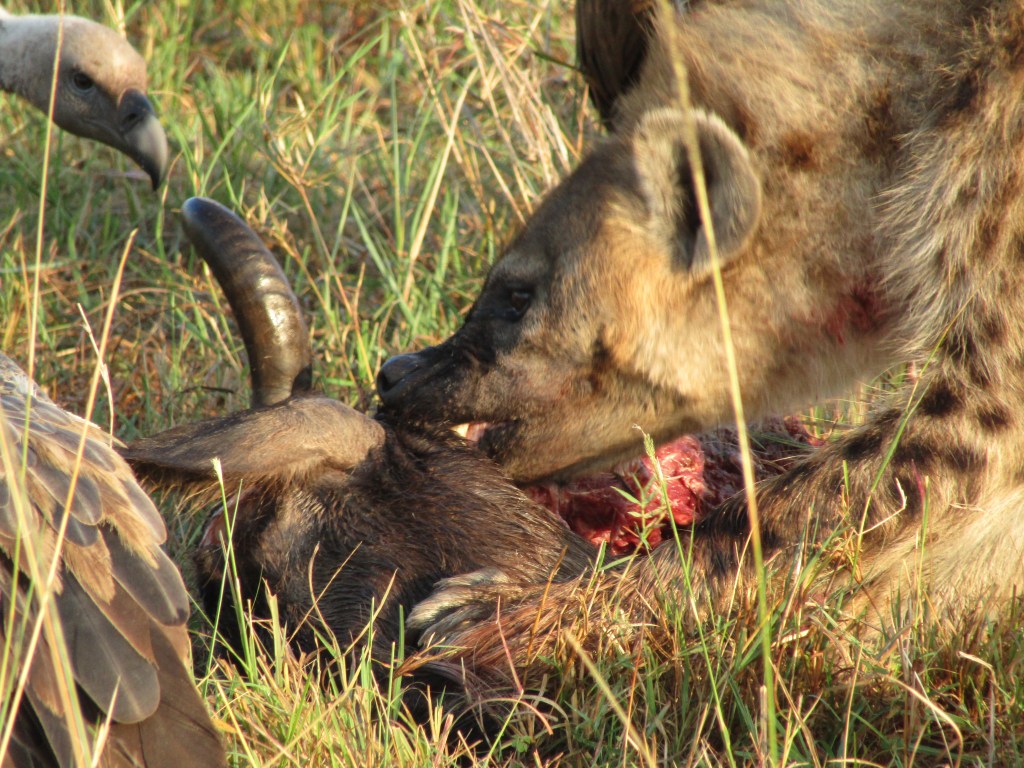 Of all the memorable things in Maasai Mara, it’s easy to tell you which one stands out. One morning we were out following a hyena. He found a carcass of a wildebeest and proceeded to eat from it very noisily while a wake of vultures circled and jumped in for a mouthful when they saw an opportunity.