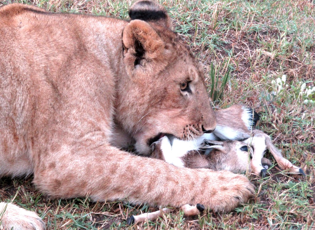 Then we saw a large pride of well fed lions a short distance from the carcass. One big lioness walked up to within two feet of the front of our 4×4. Jo took out her iPhone and started videoing the lioness. When the lioness got right in front of the 4×4, just as she was walking over a shallow gully, she suddenly looked down, and dipped her head into the gully. Just as Jo wondered why a lioness would stick her mouth in the dirt, the lioness raised her head, holding a tiny squirming baby gazelle in her jaws. It looked like she just picked it up instinctively though she had just eaten and had a full belly. As soon was the rest of the pride saw her with the fresh prey, they started running towards her. She took off. Eventually she gave the gazelle to one of her male cubs who ran around with it proudly, fending off his siblings. The mother lioness did not help him, but she did keep the two other adult lionesses from approaching her cub, though it wasn’t done aggressively. The pride played and jumped on each other and rolled over and ran around while the young lion cub ate and licked on the baby gazelle. We watched for at least an hour and Vivian and Evan commented on how similar the big cats were to their distant domesticated cousins. And Jo wanted to take one home. All the while we also left terrible for the baby gazelle and an adult female who watched from a distance who we assumed was the poor mother. Cuteness and deadliness in the same beasts. Birth and death next to each other. Sometimes horror. But no evil.