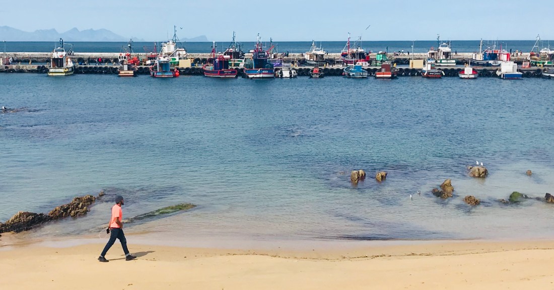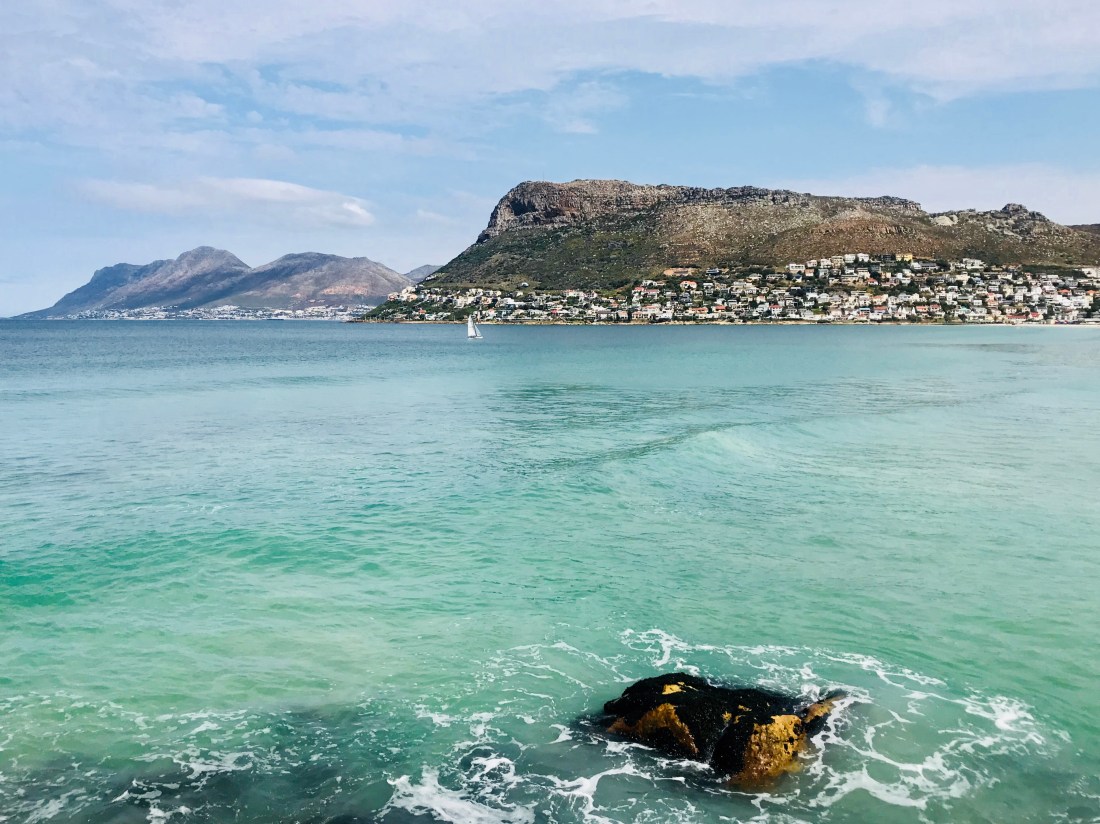 After Muizenberg the tracks ran by the very edge of the bay. The scenery was striking – the deep blue waters of False Bay with sandy beaches interspersed with rocky shores on one side, and steep hills rising up on the other. Small fishing towns were precariously perched between the hills and the ocean. We saw a couple of whales from the train!