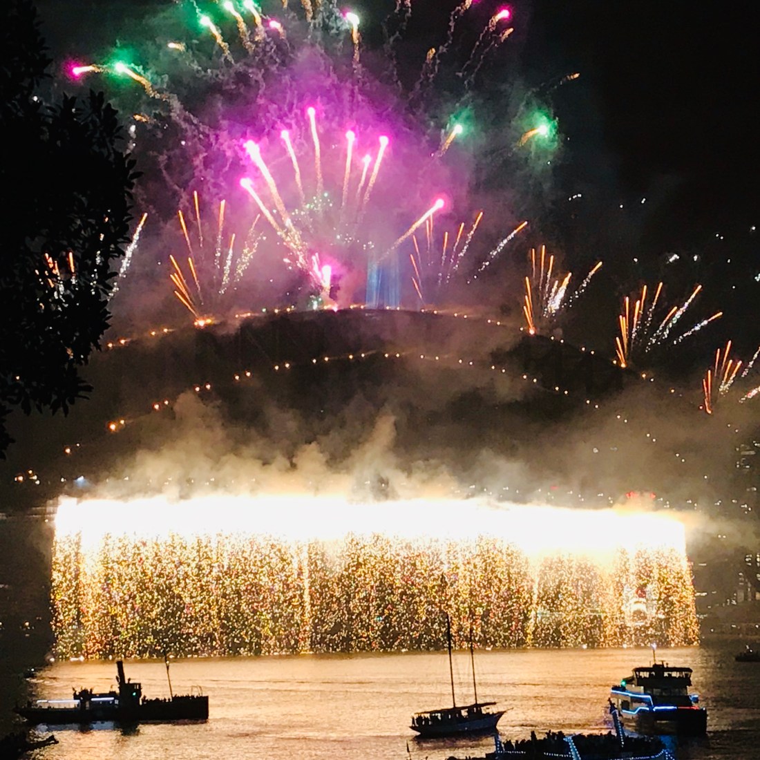The fireworks at midnight were spectacular. Then the grand finale blew us all away. The Harbour Bridge becomes a giant rack from which a dazzling array of pyrotechnics light up the land and the sea and the sky. Barges are towed to under the bridge and there’s fireworks flying off the barges every second. At the end, the entire width of the bridge erupts in a shower of golden sparks that slowly fall down to the bay below as if the bridge was the top of a waterfall of fire. This carries on for several minutes while the crowd cheers madly.