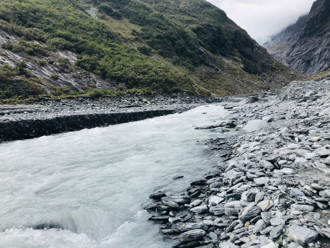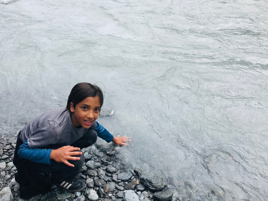 On the walk back we admired the steep sides of the valley. The kids horsed around on rocks beautifully eroded by the glacier. And Evan made us trek down to the stream of ice melt, almost white as milk to see if it really was cold. It was.