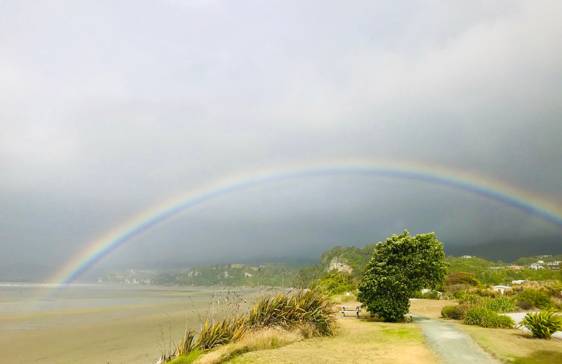 We continued northwards from Pupu and ended up at Golden Bay in a small town with a beach and we saw the most amazing rainbow. Rainbows usually seem so distant. This one was right there. One end looked as if it had plopped down on cows in a pasture. You could literally see cows walking through rainbow light. The other end was on the beach. Evan ran through it (from our perspective, though for him the rainbow would appear to keep moving further away).