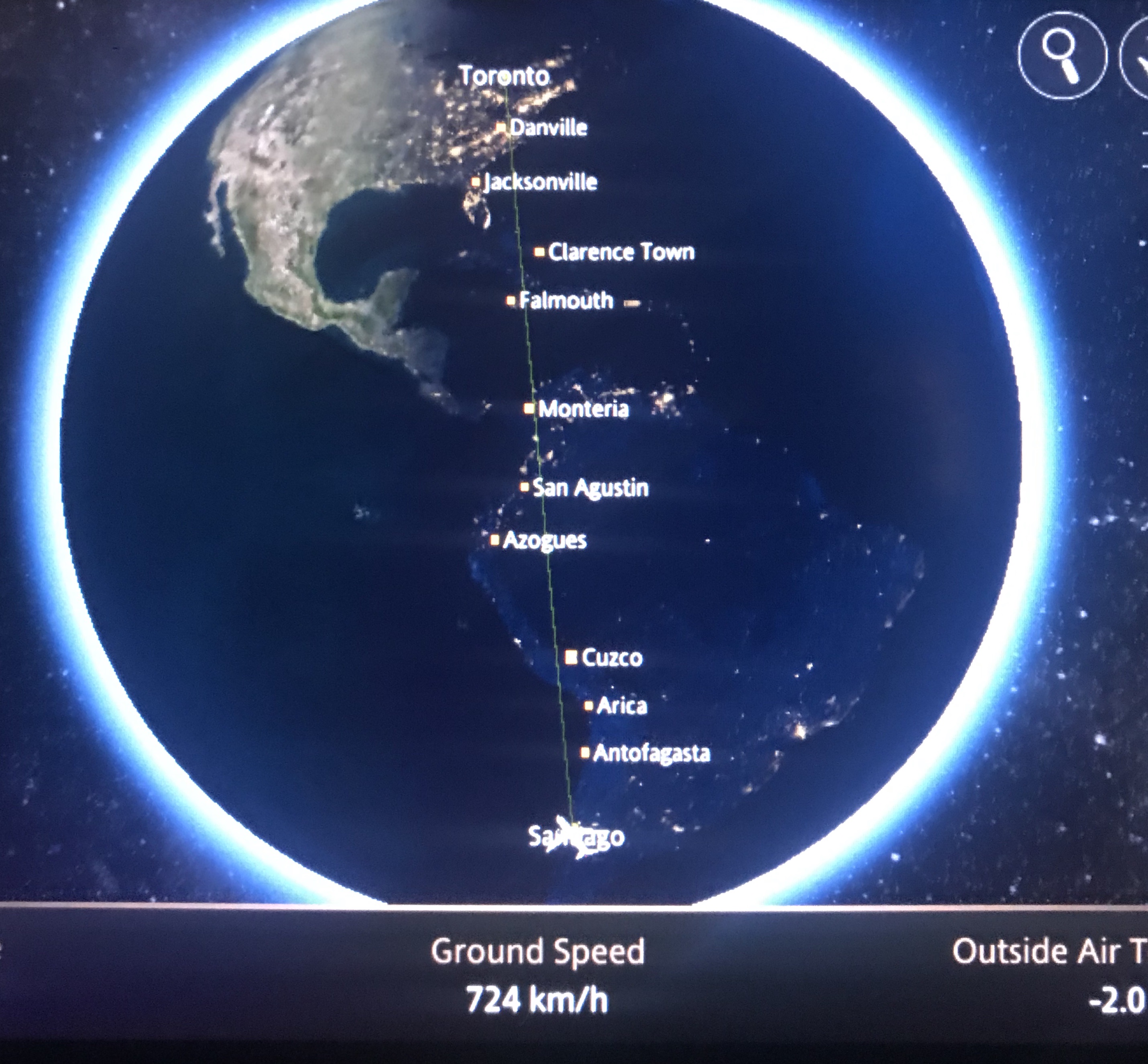 Once we decide to head home the rest is easy. Drive for four hours from the Lake District to Temuco. Fly to Santiago, Then to Toronto to Austin, and finally drive to Canyon Lake. Jo abbreviates this as drive-fly-fly-fly-drive. The only long stretch is the ten hour Santiago-Toronto flight.