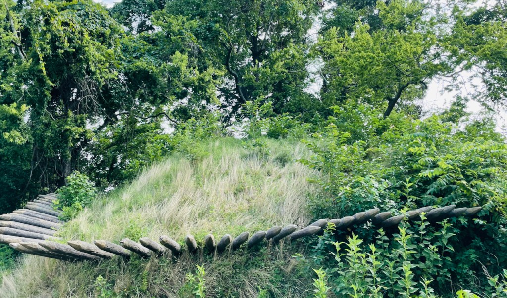 Sometime during the last few decades historians have recreated the earthen lines of the allied forces from historical data. The French and Washington’s troops attacked Cornwallis and his English troops holed up in Yorktown in October 1781. The French provided a naval blockade along the York river to prevent the British from resupplying from the water. Aaron explained all this as we walked along the trenches and earthworks, imagining cannon balls and mortar shells raining down on both sides that were separated by less than half a mile. Then we walked up to Redoubt Number 10. Redoubt is a new word in my vocabulary. We learned from Aaron that it is an enclosed defensive fortification that is usually separate from the main fort and is a often a raised earthen structure. In the case of Yorktown the redoubts had steep earthen walls and sharpened timber palisades and trenches under them that made scaling the redoubt difficult, especially when someone from above was shooting musket balls at you.