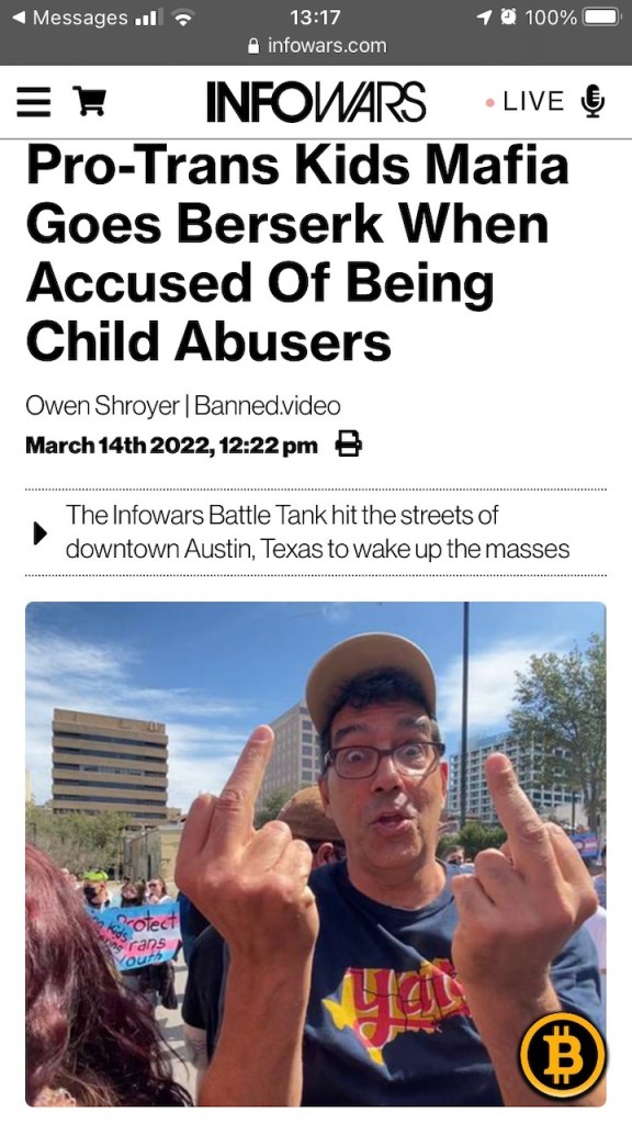A journalist from a much admired local publication of the highest standards got a great photo of Vivian’s friend’s dad and outed him as a member of the dreaded Pro-Trans Kids Mafia, y’all. It turns out yet again that when they need it, the conservatives crave a spot of big government. And no, all you CRT hating parents, you don’t know what is better for your kids. Let’s have the Fuckernor decide.