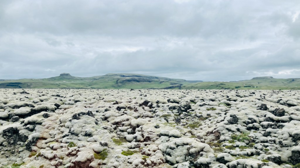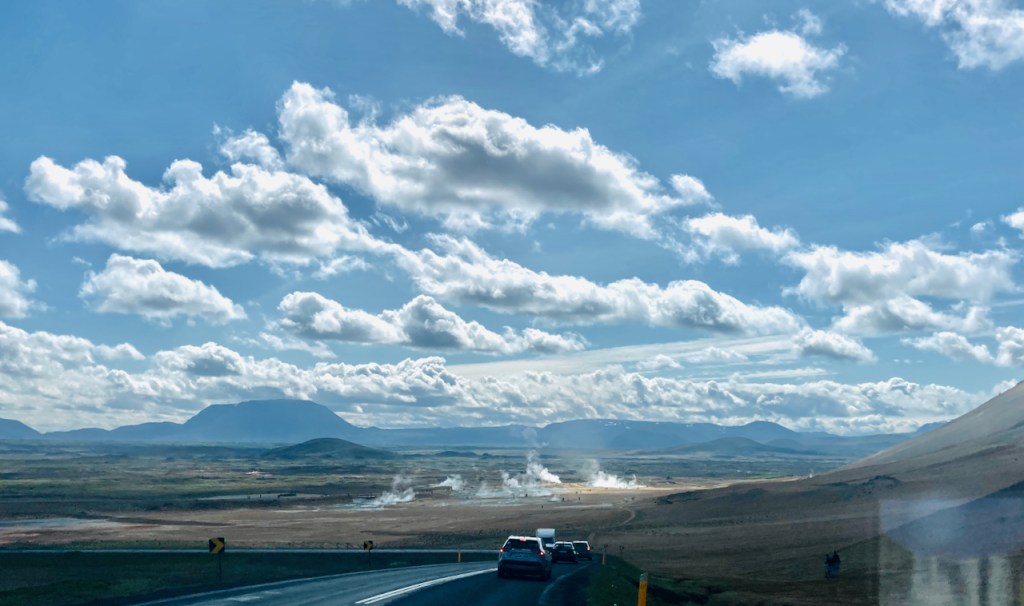 We drive past the Douche Perpétuel and under steam pipes at the geothermal station to where lava flowed during the 1975 activity. We park and walk across about a mile of lava rock to a small pale blue lake that is gently steaming. Further to the west we see the extent of the lava flows. Black fresh lava rock covers many miles of low-lying land, rising up around the edges of hills and nearby mountains. Steam emerges from fumaroles though it doesn’t smell half as bad as it did down in Hverir. Or perhaps I am desensitized to farts.