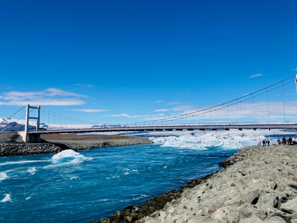 As the ice cap shrank, Breiðamerkurjökull retreated from the Atlantic and left behind a depression in the earth’s crust created by the weight of the ice over thousands of years. In the past century this became one of Iceland’s newest but deepest lakes. Most of the other glaciers end in braided rivulets that becomes streams and then rivers of glacial melt. Breiðamerkurjökull terminates at Jökulsárlón – the glacier lagoon – where ice calves off the glacier, floats around in the lake, and then flows out to sea under the one-laned suspension bridge on the ring-road.