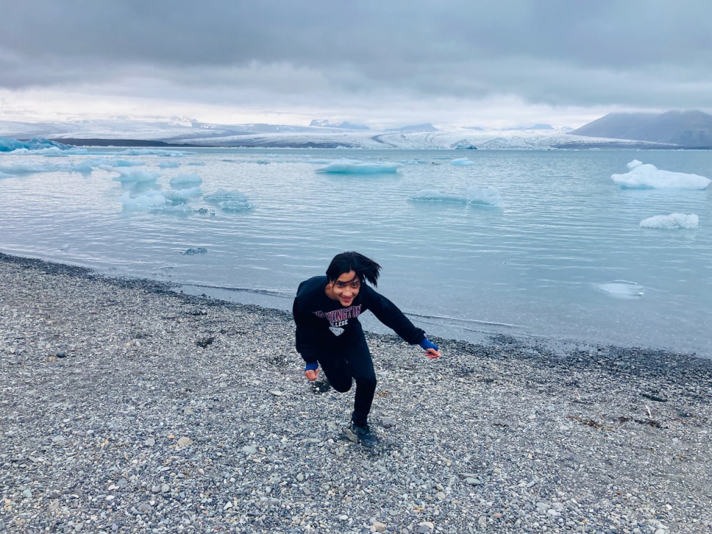 This depressing news made me very sad and when we got back to the hotel I finished the rest of the bottle of Olafsson Icelandic gin while Jo and the kids got into the nice wooden hot tub that was filled with hot water without requiring fossil fuels. In the morning we went back to stare at Jökulsárlón some more and to walk along it’s shores and up to the swirling blocks of ice on the beach on the Atlantic side. In the very last photo Evan is running along the lake like a freak. Behind him and across the lake is Breiðamerkurjökull. To the right there is a brown hulking mass of a rocky mountain sloping up above the glacier. The four of us were up there on the ice yesterday for the walk of a lifetime! Thank you, Iceland.