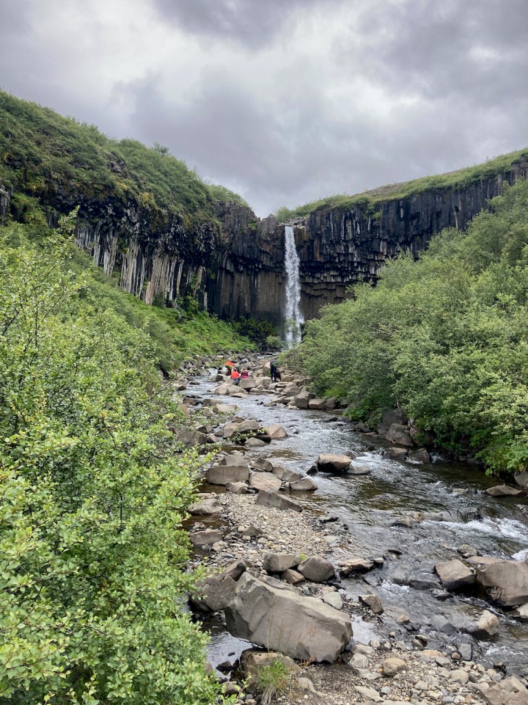 Then I need to join a zoom for work for an hour. I put on my headphones and zone out. My phone’s signal is good enough to carry on a video zoom with several people scattered around the US while Jo drives us to our next destination, conveniently just over an hour away. When I finish my meeting I find that Jo has taken one of her famous shortcuts and we in the middle of nowhere. We are on a narrow remote dirt road. A few minutes later we turn up into one of those dreaded F-roads, but just for half a mile. We park and walk the last mile and arrive at one of Iceland’s most dramatic and remote waterfalls – Aldeyjarfoss. The Skjálfandafljót river (“the river of trembling rapids”) gushes out of a barren rocky moonscape down twenty meters of basalt columns into a churning cauldron of seething water before making a right angled turn and flowing on downstream.