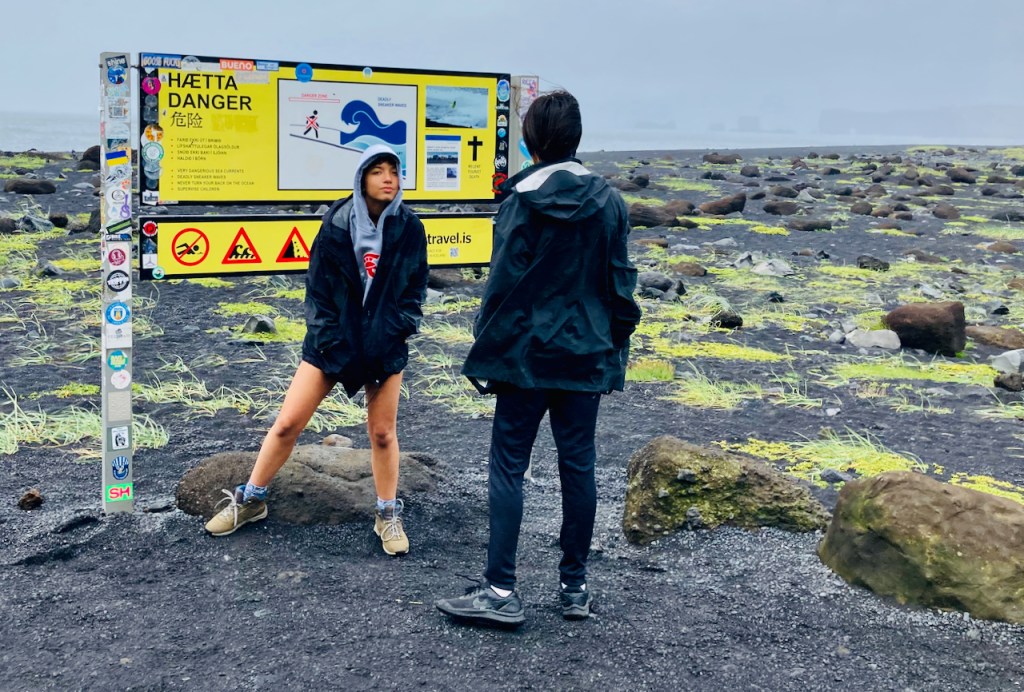After breakfast we climb the steps to the observation platform overhanging Skógafoss. Then we pack up and drive to nearby Reynisfjara Beach. During the short drive the weather turns from beautiful summer morning to North Atlantic gale. By the time we arrive at the beach the rain has mostly stopped but the wind is still howling. I had primed the kids by showing them a YouTube video of stranded tourists on this beach. They had wandered to the edge of the water as most people on beaches do and a rouge wave had come out of nowhere. Several of them suddenly found themselves foundering in waist deep ice cold water. No one was washed out that day but it does happen. Vivian and Evan stop and read the warning sign before they go on the beach, and they are extremely cautious.