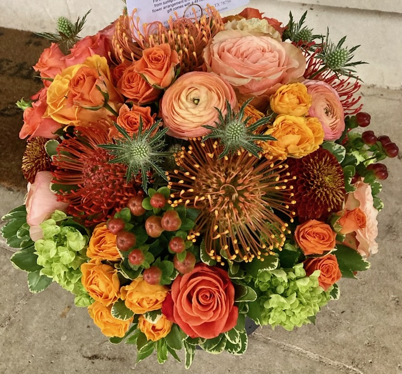 While I was on the east coast with Vivian back in Fall, Jo and I reached a milestone of being married for 19 years, a nice round number in base 19 I suppose. Jo and Evan were back in Austin. I called a good florist in Austin who was willing to go through a bouquet flower by flower. I replicated the colors of our wedding centerpieces and made sure that there were no lilies. This is the photo they sent when they dropped it off reluctantly at our doorstop (“Sir, it’s 76 degrees and sunny in Austin and the flowers shouldn’t be outside for long”).