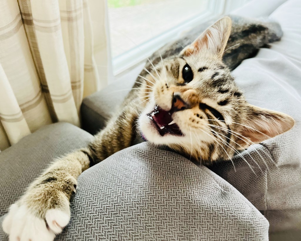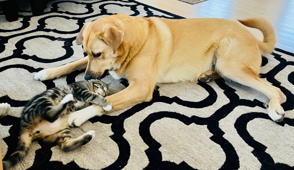 Phineas Schrödinger is growing up quickly. He does not spend as much time on Jo’s boobs or our shoulders but he still is a loving wonderful kitty. He and Ouiser are great friends and they tussle with each other several times a day. At times he leaps up and grabs Ouiser’s head. Ouiser reciprocates by gently holding Phineas’ entire head inside her jaws. Zeus is getting to be slightly friendlier towards Phineas, but it is still too early to tell if Phineas is a butt head or is trying to play with Zeus. Cats, inscrutable as they are, keep us guessing.