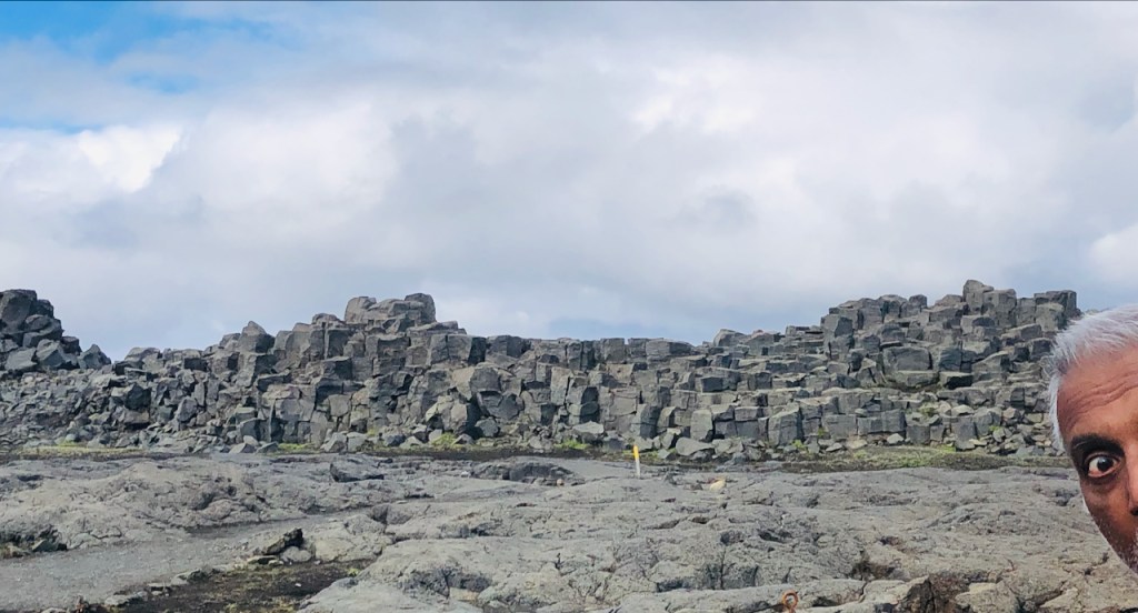 Stop #3 of the day is Þingvellir National Park. When we get there it is drizzling and the wind is still blowing pretty hard. Pronounced in English approximately as Thingvellir, this area is described as the heart of Iceland. It is the place where the AlÞingi or parliament of Iceland met from about 930 AD up to 1798, and where modern Iceland got its independence in 1944. The AlÞingi is described as one of the world’s oldest surviving parliaments. In the commonwealth period before Iceland became a part of Norway and then Denmark, all the chieftains of Iceland and “at least one in nine” of his farmers met at Þingvellir once a year to sort out matters of common importance, decide on laws, and dole out justice. Even common free men could bring up any matter of importance. And somehow, unlike most of the world around them, especially their European brethren who are still intoxicated by their antique cartoonish kings and queens, Iceland, like a more recent Athens, was a beacon of representative government. Now, I can’t determine otherwise, but it is safe to assume that serfs, slaves, and women got the shaft even in this precocious and otherwise commendable parliament. But the spirit of Þingvellir lives on and Iceland continues to be a national and international supporter of rights for everyone today.