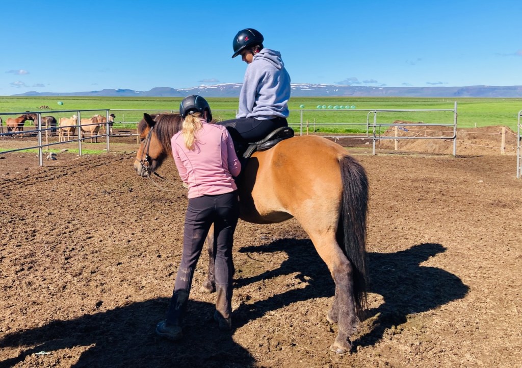 Presently two young women rode into the corral. They and their horses were breathing hard and the girls had big grins on their faces like they had just finished having fun. The horse trainer (the other one worked mostly with the sheep) told us to sign up and pay online which Jo did on her phone. Then they got Vivian and Jo their horses (Naria and Doogar), and a bucket full of brushes and showed them how to brush their horses.
