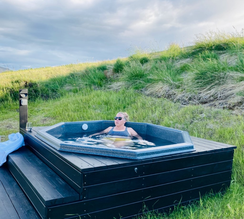 We continued east and north on the ring road after Akureyri till we finally got to Svartaborg, our home for the next three nights. The cabin is one of six lovely modern buildings well spaced out on the side of a grassy hill. Vivian read, Evan and I played chess, Jo got the outdoor hot tub ready, and we enjoyed the rest of the lovely day. Another day in paradise.